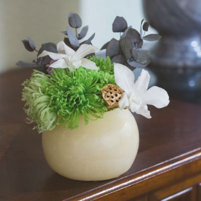 新色のローズ、FLAXの新商品でまとめた大人の男性にぴったりなシックなアレンジ。