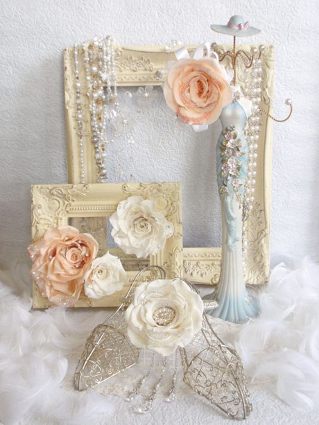 花嫁が身につけたアクセサリーを飾る幸せの空間。布にビーズ刺しゅうをし、プリザを1枚ずつ足したお花です。