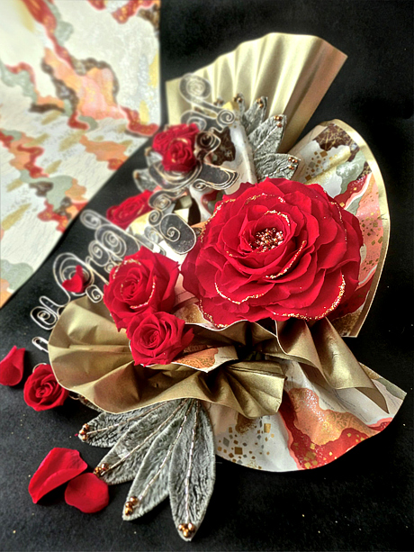 振袖の帯結びがモチーフです。帯の模様の花や川が溢れ出し、目の前で立体化した世界を表現しました。