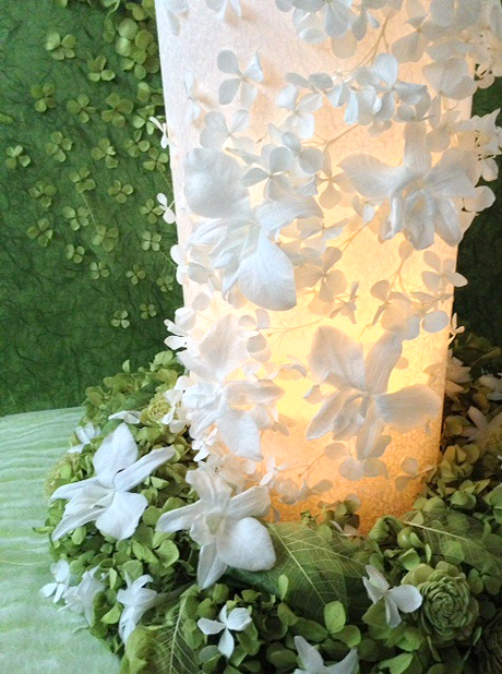 和紙で作ったランプシェードに、プリザーブドフラワーをあしらい、優しい、幻想的な作品に仕上げました。