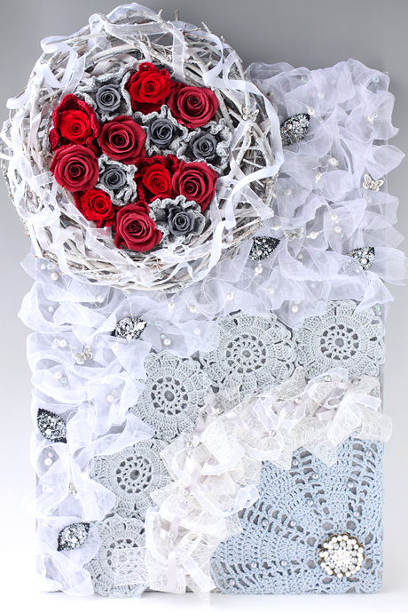コットンヤーンのクロシェでバラを優しく包み、コットンパールの輝きで柔らかい光を添えて、手作りの優しさと柔らかさをシャビーシックに現しました。 |