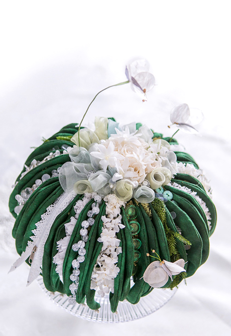 緑の布をバイヤスにし、綿花とワイヤーを入れタニワタリに見立てました。 蝶々の胴体も触覚も布、糸、ビーズでしあげました。