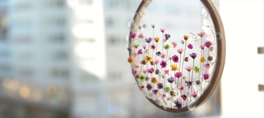浮遊感が楽しい刺繍枠リース。ドライフラワーの軽さとカラフルな色合いを楽しんで!