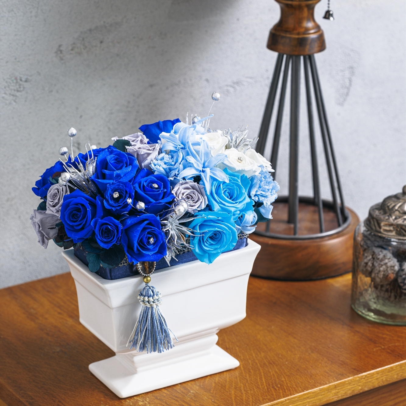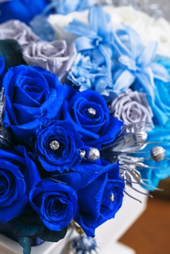スパークリングローズ・グランブルーの上品な色合いに、ビビットなライトブルーを組み合わせたアレンジです。