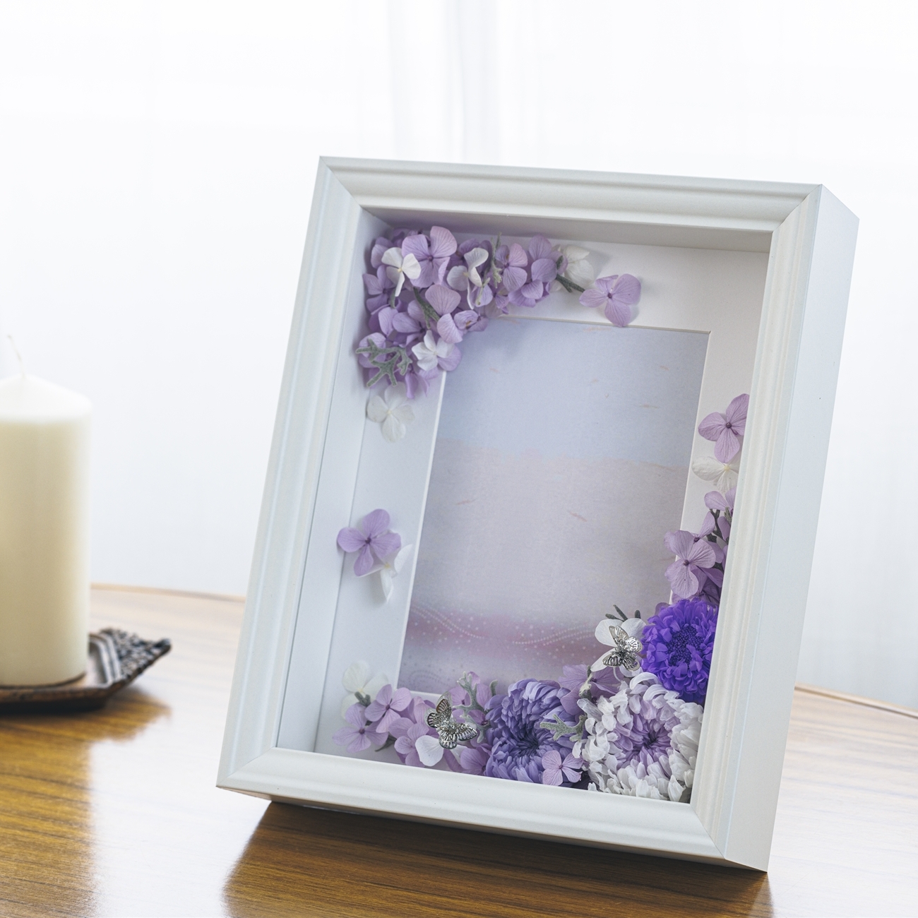 シンプルにマムと同じ色のアジサイを使用し、フレーム全体に華やかさと和らぎを出しました。