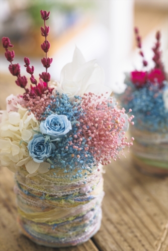 器はハードな質感ではなくソフトに軽やか、優しい色調と繊細な感じの多種多様なリボンの組み合わせで