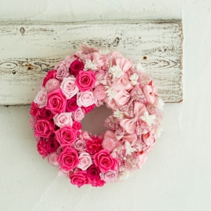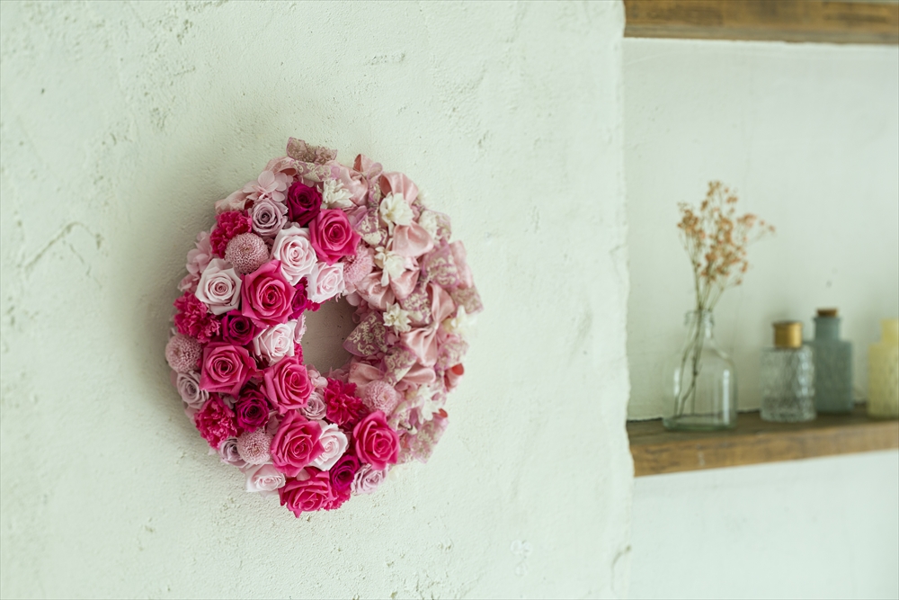 新色の「ドルチェピンク」を使った甘く鮮やかな色合いのリースアレンジ。