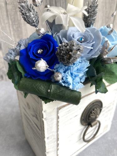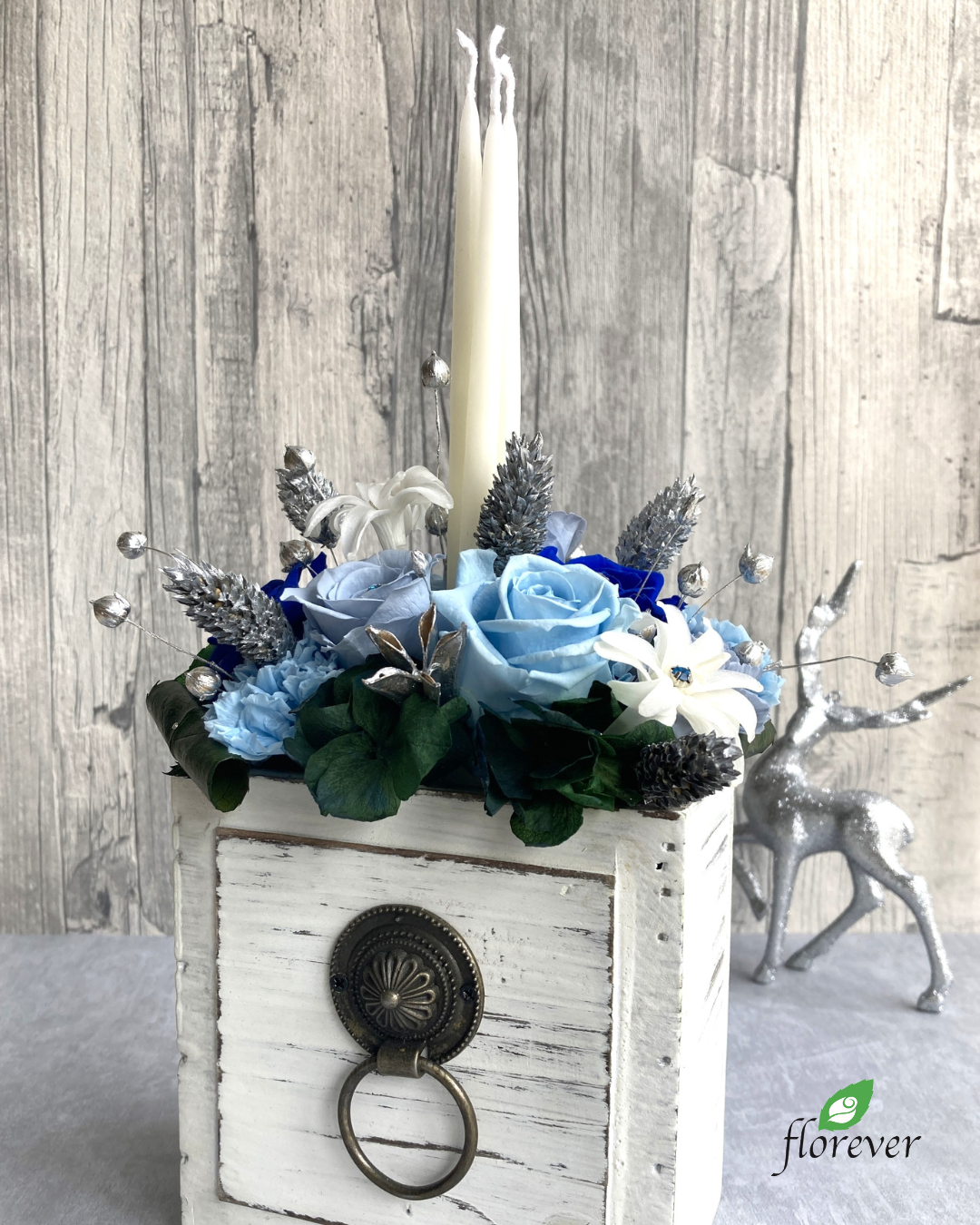 「ミックスパレット」のブルーとシルバーでクールな雰囲気のキャンドルアレンジ