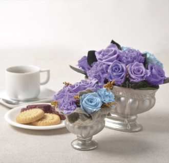 コロンとした形が可愛らしいカップ咲きのステム付きガーデンローズ。生花と同じようにディスプレイできるスリーブ入りタイプです。お買い求めやすい価格でアレンジやブーケにご使用いただけます。