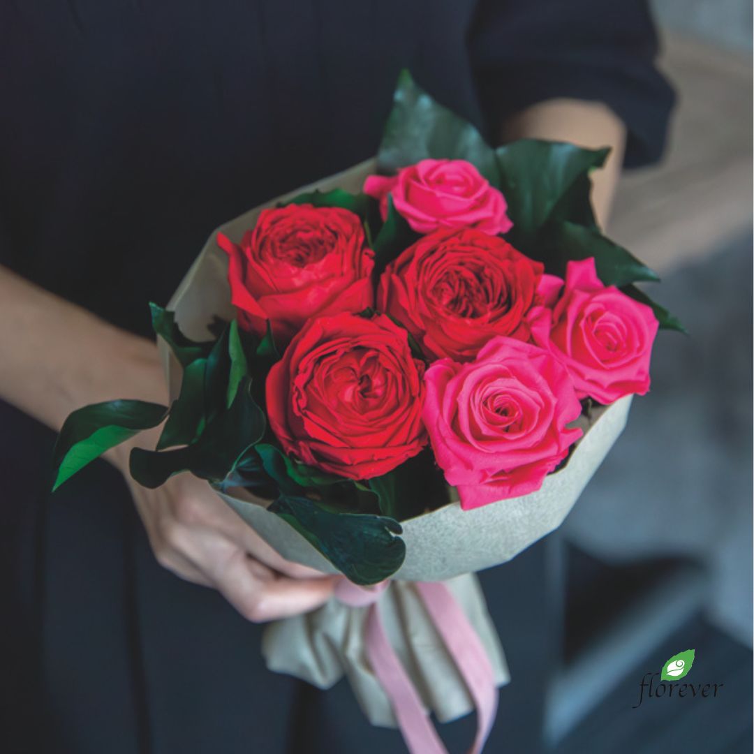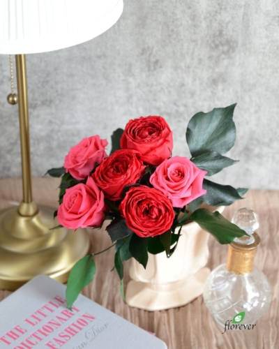 今回はショートステムローズ「ホットピンク」とミックスしてみました。ショート丈ながらゴージャスな印象に仕上がります。
