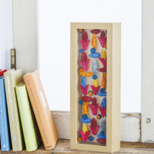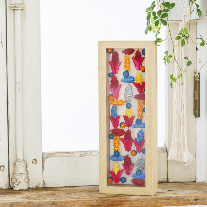 フレームの面全体に質感の違う大小様々な色、形の花材を配置し