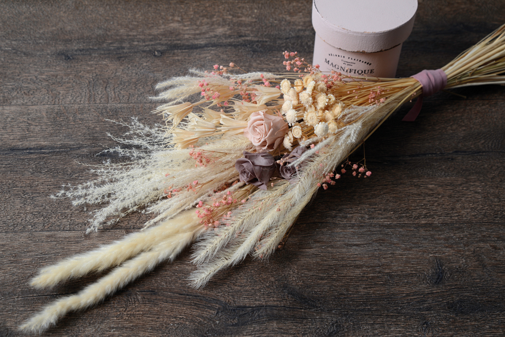 カスミソウとローズのプリザーブドフラワーが入るとナチュラルな雰囲気でも華やかさが加わります。