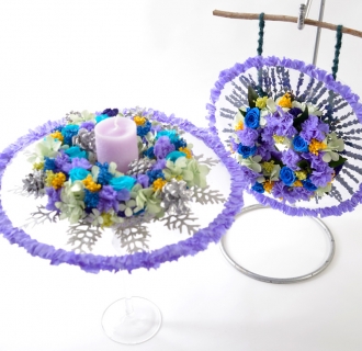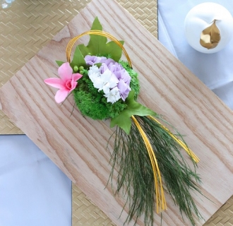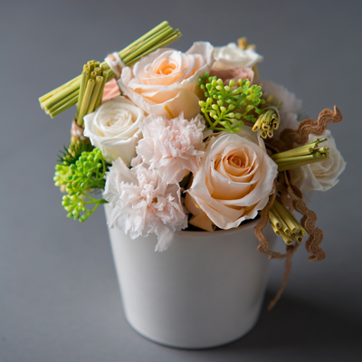 器からあふれ出す綺麗な花々・・・秋を感じさせる稲穂茎を束ねてリボンで巻き、ピック状にしてアレンジに入れました。クリアな色の組み合わせでギフトにもなります。