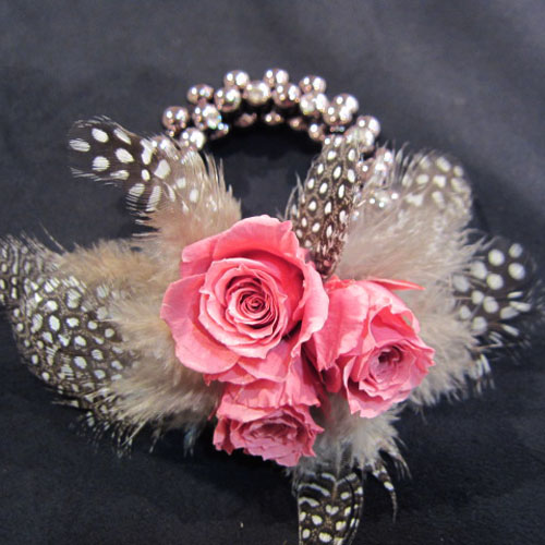 ブレスレットには、お花を貼り付けるためのパットがセットになっています。パットを付属のリボンでブレスレットに固定し、余分なリボンをカットした後、パットに接着剤でお花を直接貼り付けます。ご紹介したように、お花と合わせてパールやフェザーをデコレーションするとボリュームがでてよりゴージャスに!