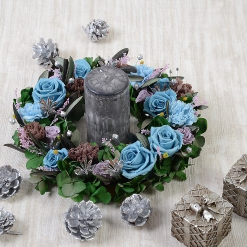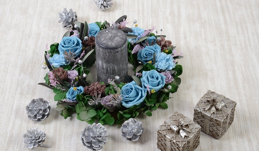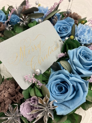 新色「ホリゾンブルー」と「ブラウングレー」を使用したクリスマスアレンジメント。