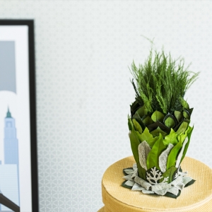 ベースからグリーンで作成しました。多種多様なリーフを重ねたり、裏表を見せて巻き付けたりしました。フラワーピンを使用したかったので、器の底のスポンジにも使用しました。