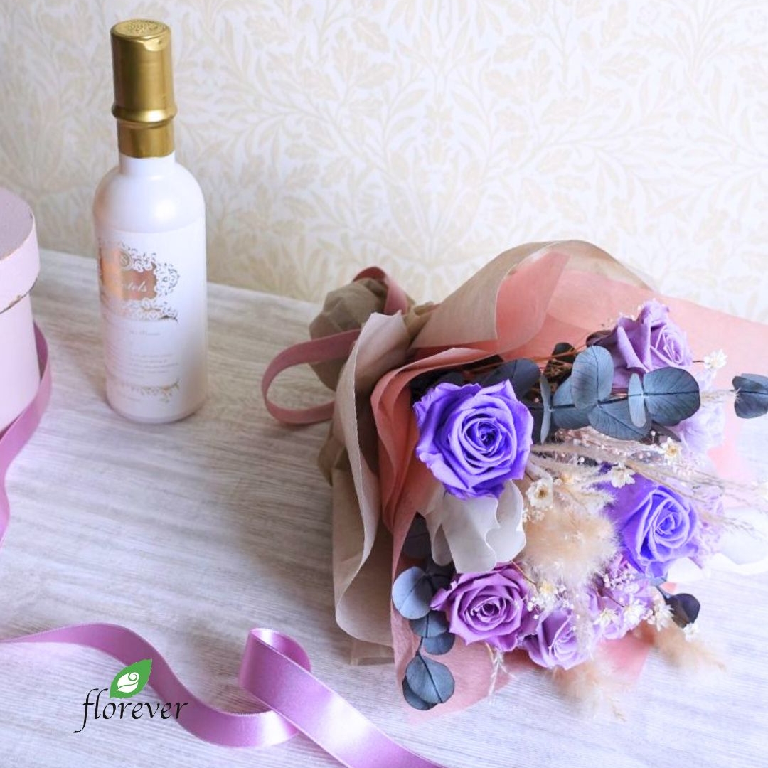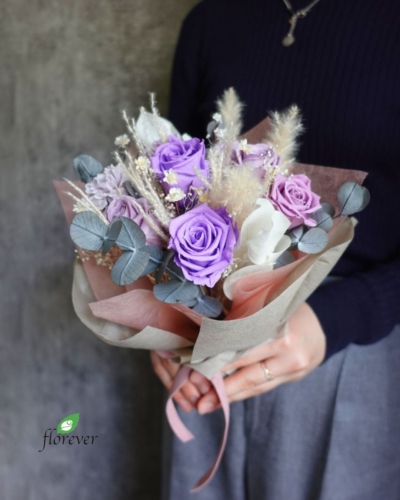メディアナローズ:オーロラバイオレットx2輪 スプレーローズ:ラベンダーx2輪、ソフトライラックx2輪 ミニカーネーション:ソフトライラックx2輪、ラベンダーフィズx2輪 |