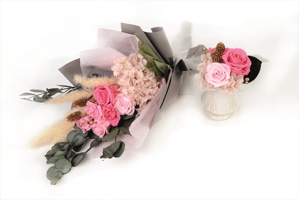 メディアナローズ:ドルチェピンクx2輪 スプレーローズ:ベイビーピンクx2輪、ミルキーピンクx2輪 ミニカーネーション:ベイビーピンクx2輪、ドルチェピンクx2輪 |