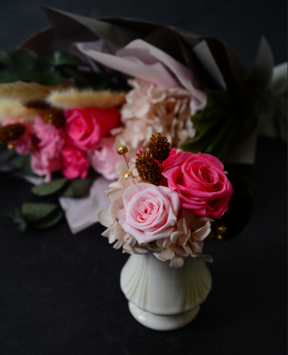 ピンク系のローズにダークな寒色系をプラスすると男性へのギフトにも良さそうです。