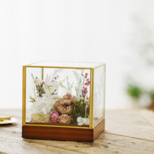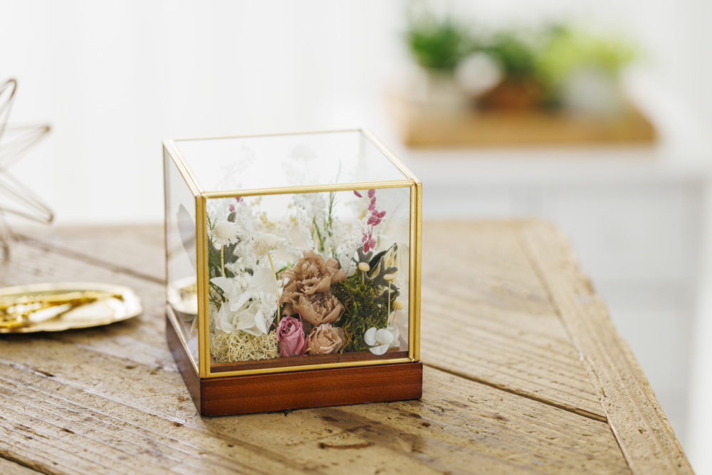 モスをベースにナチュラルな風合いで作られたスクエア型のアレンジ。