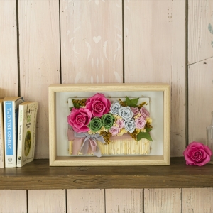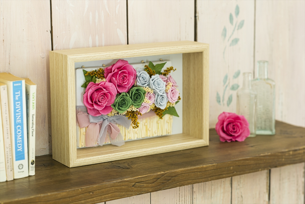 「プレタポルテコレクション」を使った自然の温もり感じる柔らかな色合いのフレームアレンジ。