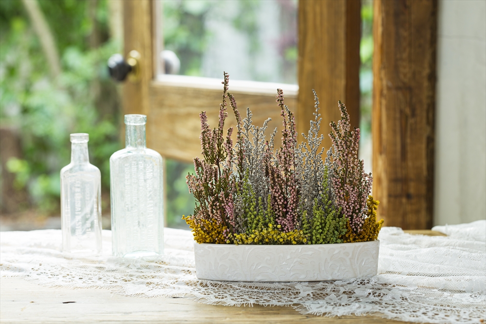 ナチュラルな小花で作る、陽だまりの温かみを感じる色合わせのアレンジ。