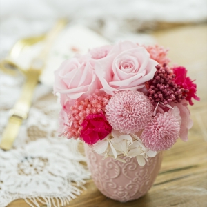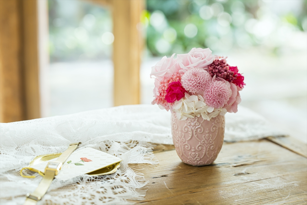 花の色に合わせて器を選び、より華やぎやときめきを全面に出しました。