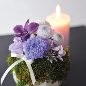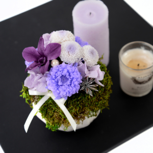 ポンポンマムデュオにアスターとデンドロビウムを加え、小さなお供え用アレンジ。