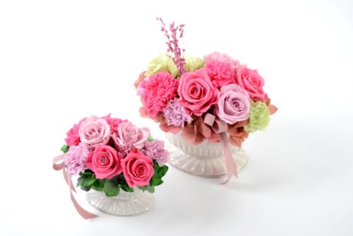 ②(左:アレンジS)のようにピンク系でまとめると甘めの優しい印象になります。