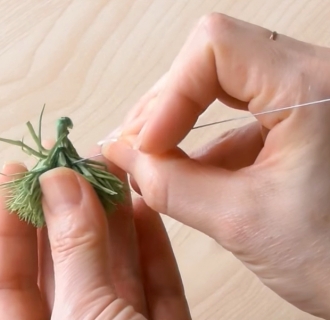 - ワイヤーを花に添わせるときに、無理に押さえるとガクが割れてしまうので、指先を使って丁寧に押さえて下さい。