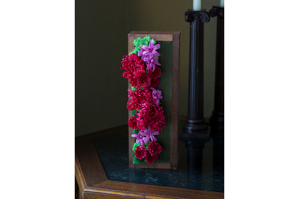 マム2016年の新色「ルビー」を使ったアレンジ。現代のライフスタイルに合わせた、新しい仏花のデザインを提案します。