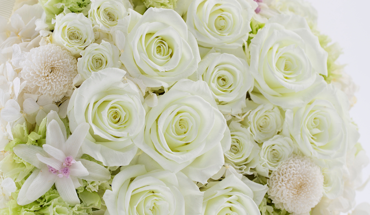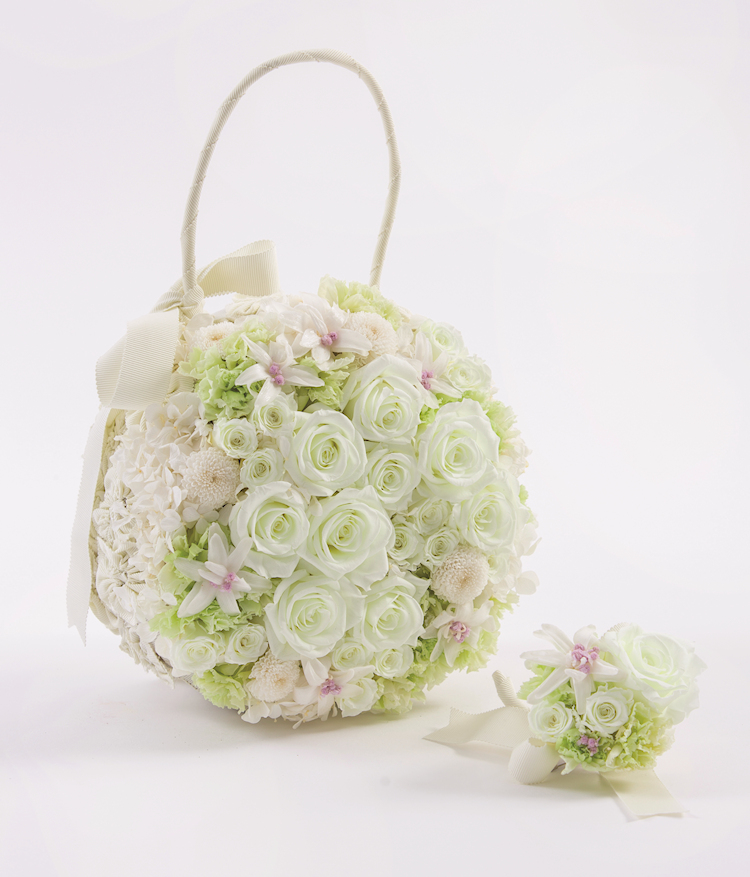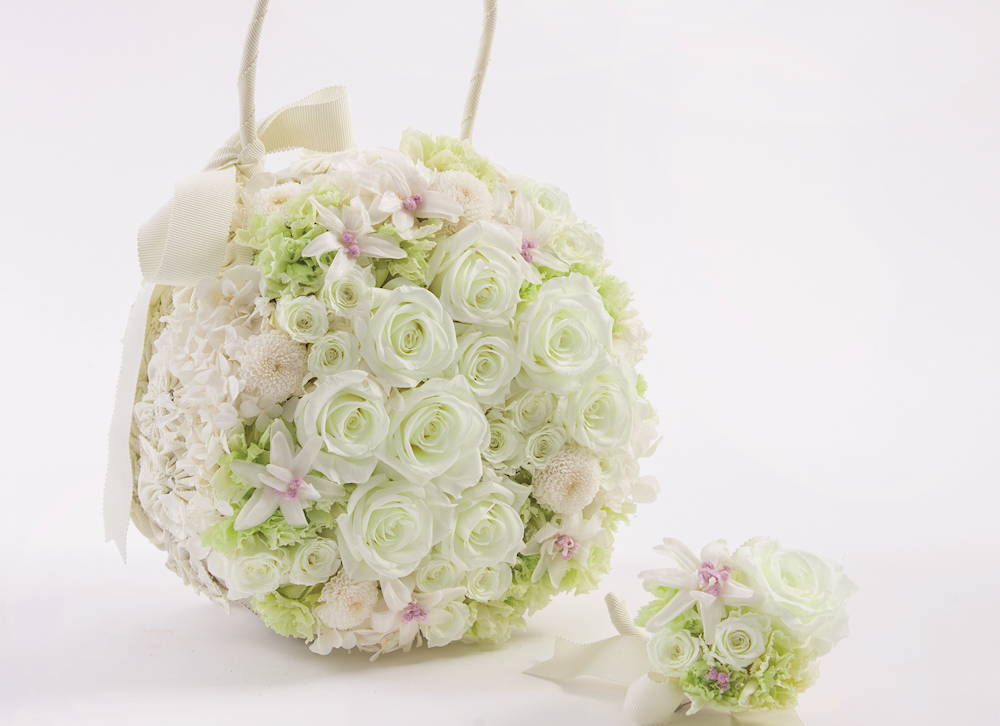 色合いは白&グリーンでシンプルにまとめつつ、お花の種類とサイズはバラエティー豊かに。