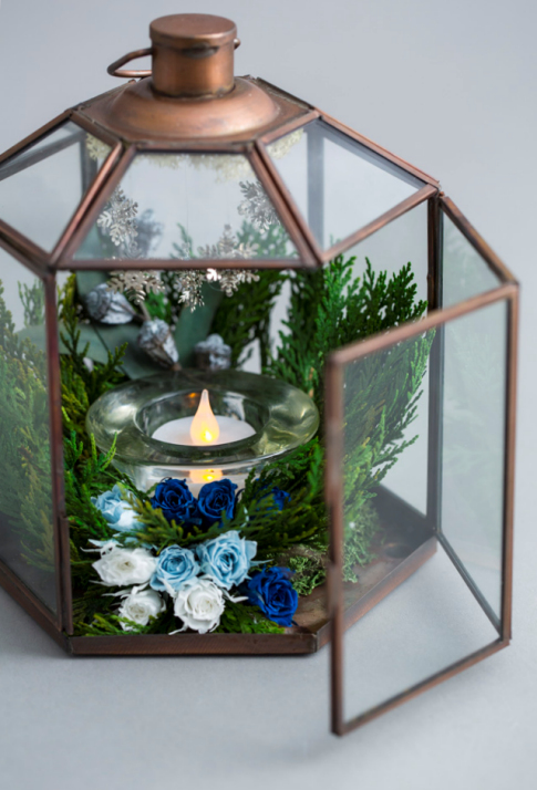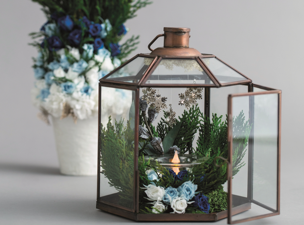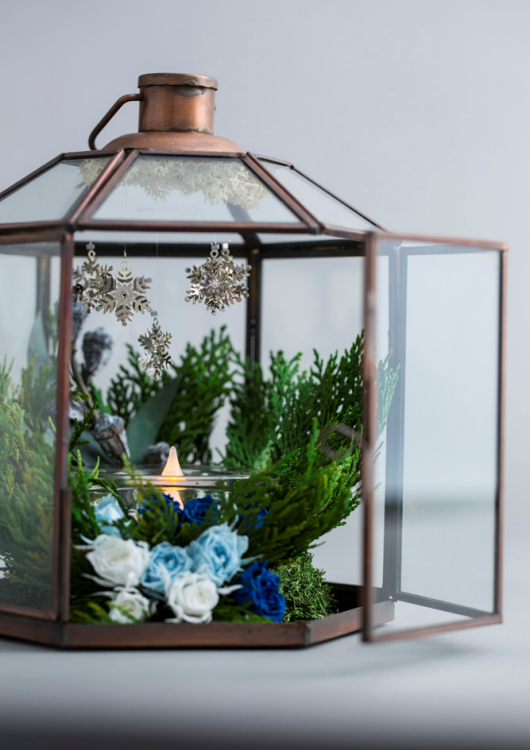 クリスマスのインテリアをイメージした、テラリウム風のアレンジ。