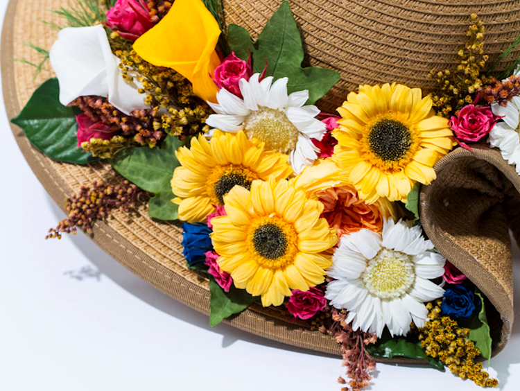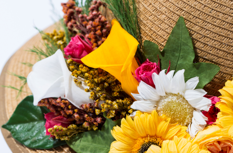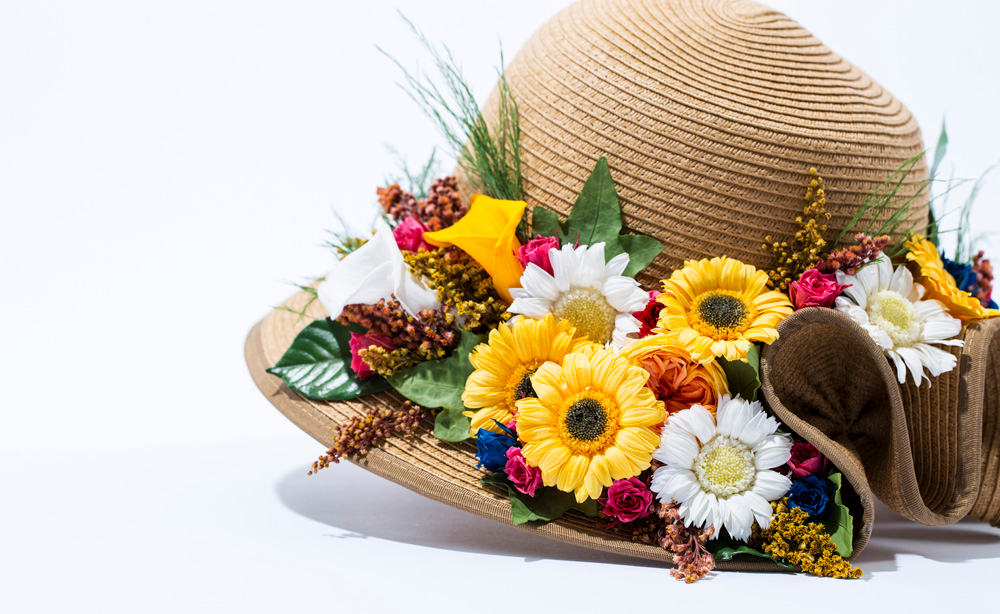 ヒダが特徴的な帽子の形を生かして、色々な種類のお花を立体的に入れています。