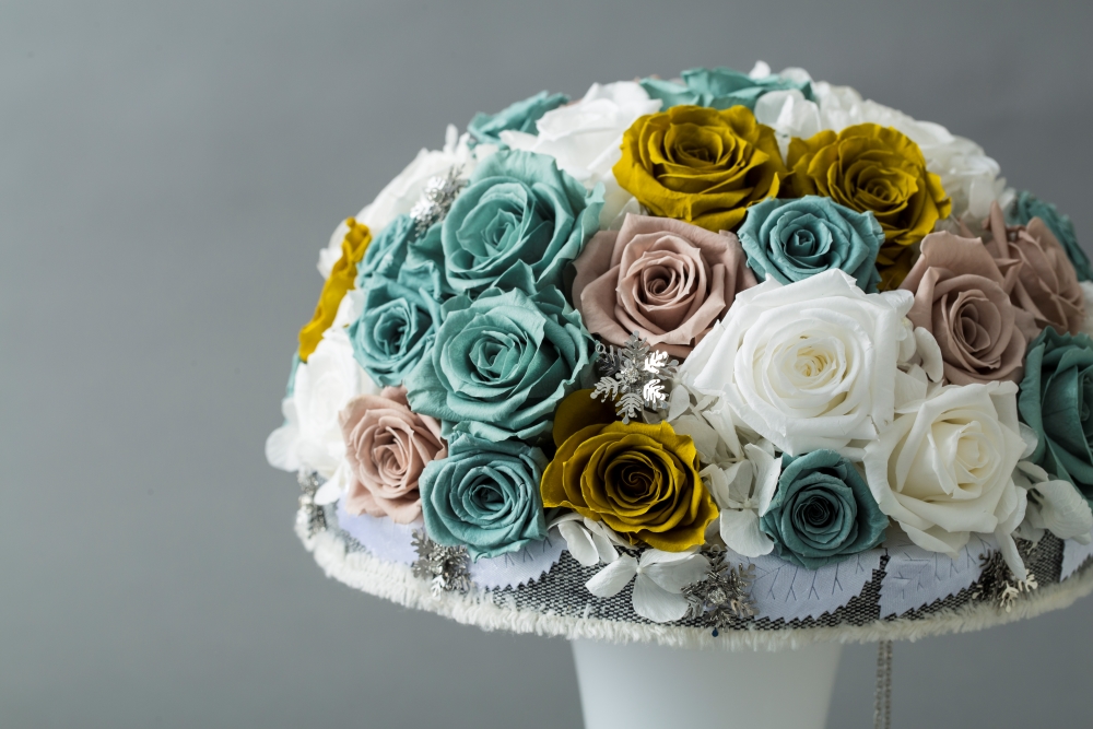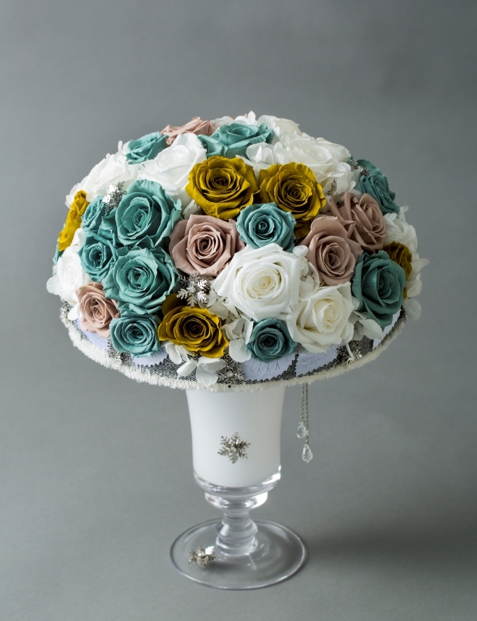 テーブルライトの傘の部分をプリザに、そんなイメージで制作しました。