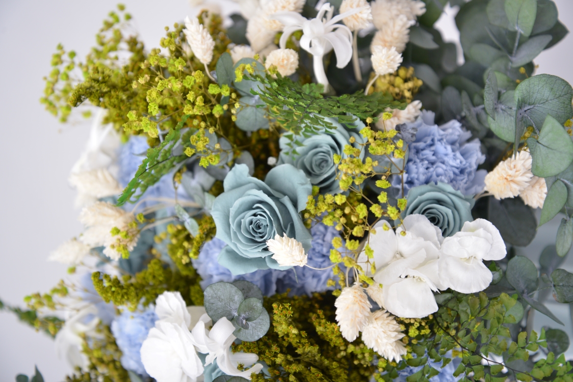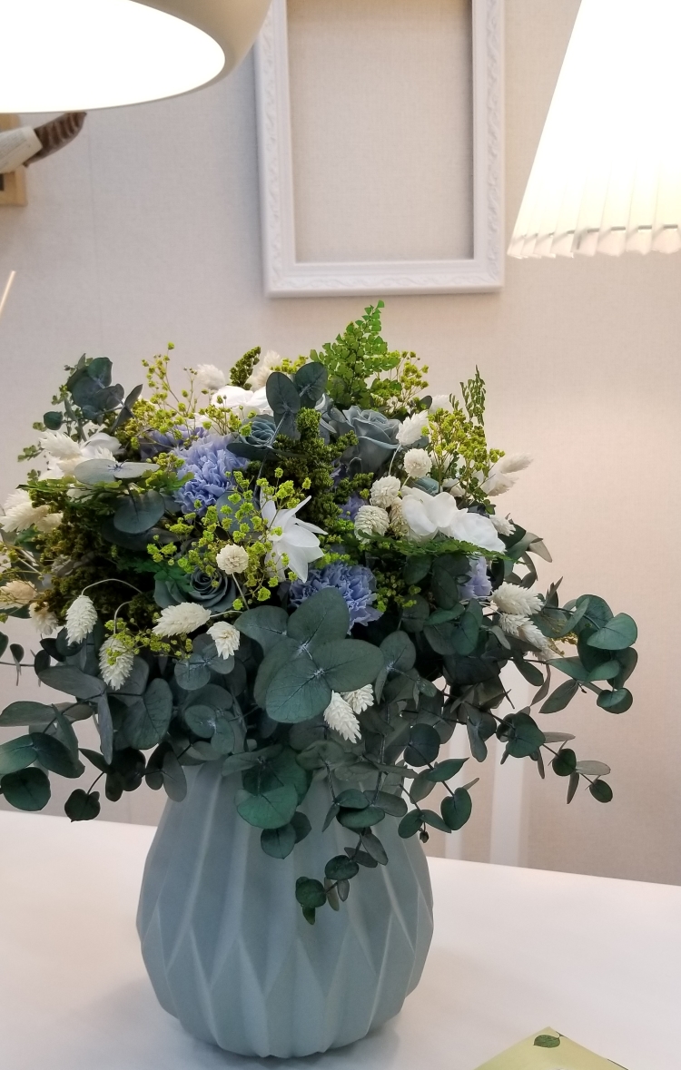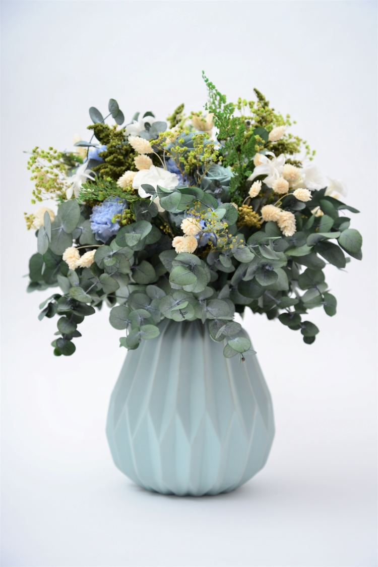 2019秋冬限定色の「ミストグリーン」のローズ、ユーカリ、花器とも、スモーキーなブルー〜グリーンの色合いでまとめています。