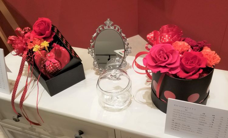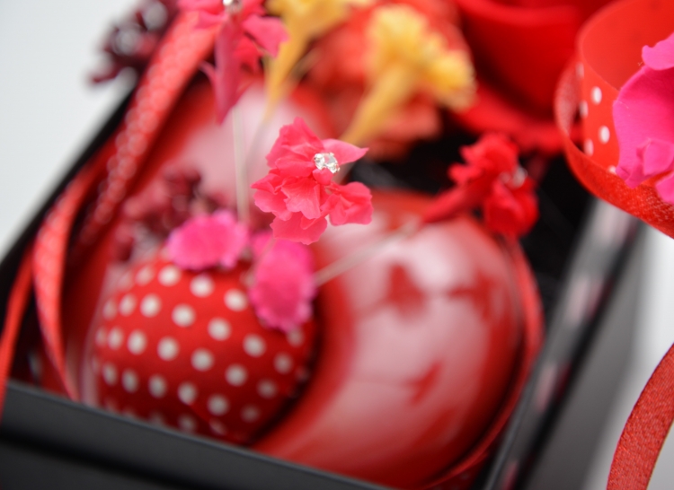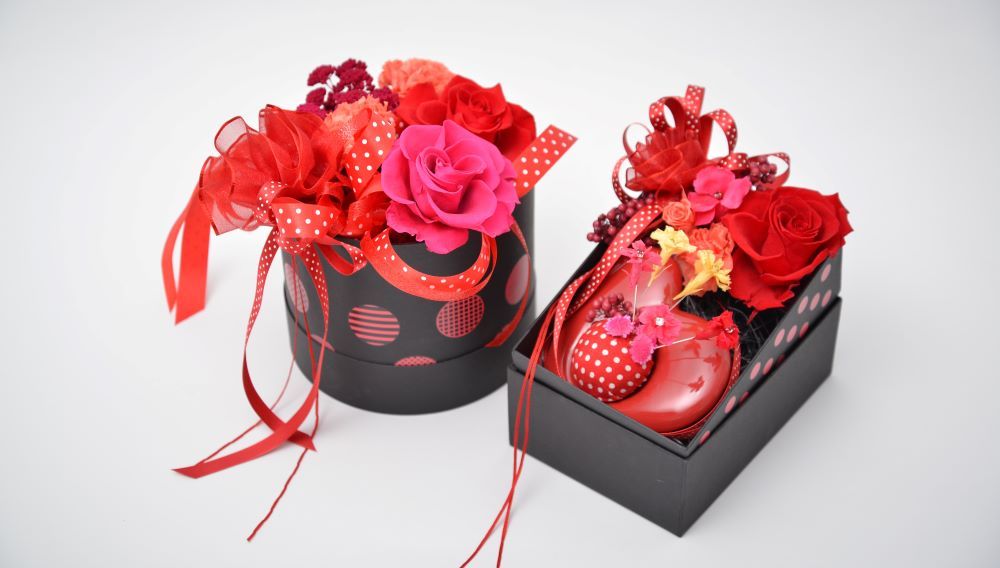 黒いボックスでぐっと引き締めてシックにまとめつつ、リボンやボックスにあしらった水玉模様でちょっとポップさもプラス。