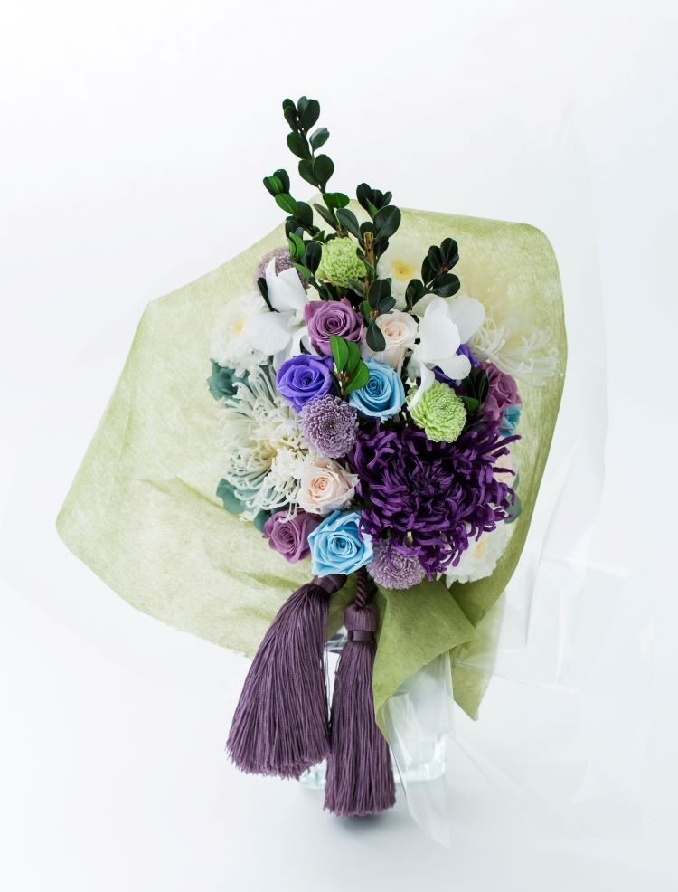 花の種類はバリエーション豊かに使いつつ、色合いは紫〜ブルーのグラデーションで落ち着いた色合いに抑えています。