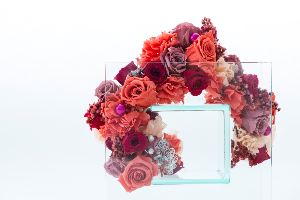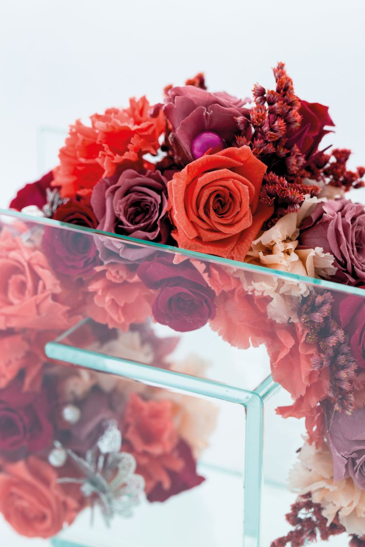 2枚のガラスを重ね合わせたような個性的な花器に、同じスクエア型を意識してプリザーブドフラワーを配置したアレンジです。
