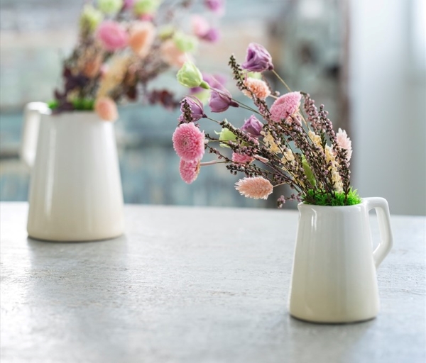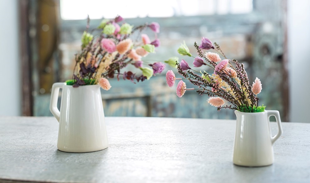 ピッチャーの形をした大小の器を使って、エリカをベースにマムやローズ、ファラリスで動きをつけます。