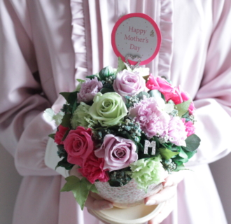 自然の風になびくような、プリザーブドとドライを組み合わせたアレンジ。