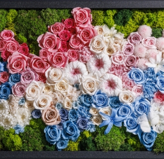 これから初夏に向けて太陽を感じる季節です。太陽のたくさんふりそそぐプロヴァンスのファブリックを器に、お花は、フロールエバーの新色、当Shopでも人気のクランベリーを4輪メインに使用しました。ファブリックとお花のカラーに統一感を出しています。