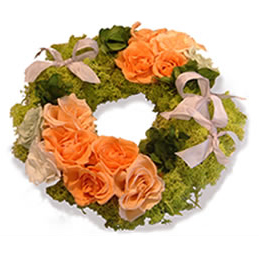 去り行く夏の木漏れ日をイメージしたリースです。上質なフロールエヴァーのス プレーローズとライトグリーンのモスといった素材を活かして、透明感とナチュラルな軽やかさを表現しました。リボンはグレーともアイボリーとも違う微妙な カラーで全体をまとめるようにコーディネート。キュートでフレッシュ、フルーティなイコアスタイルに。