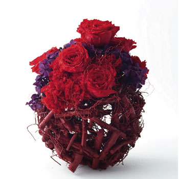ガーデンローズ・エリザベス(チェリーレッド)、スタンダードカーネーション(チェリーレッド)、アンデスアジサイ(バイオレット)、