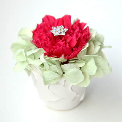 小分けにしたグリーンボールとカーネーションで、ちょっと変化のあるテクスチャーのアレンジに仕上げました。