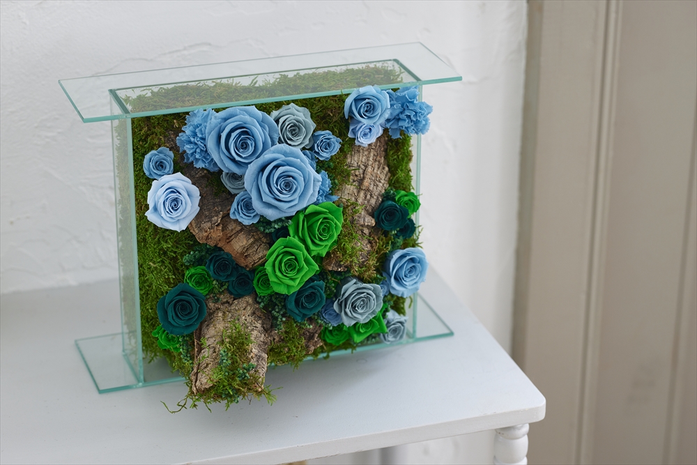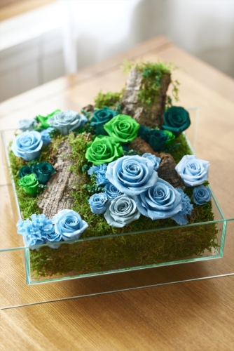 また、力強さを表現するのにブルー系グリーン系のバラを濃淡・大小と盛り付け配置しました。