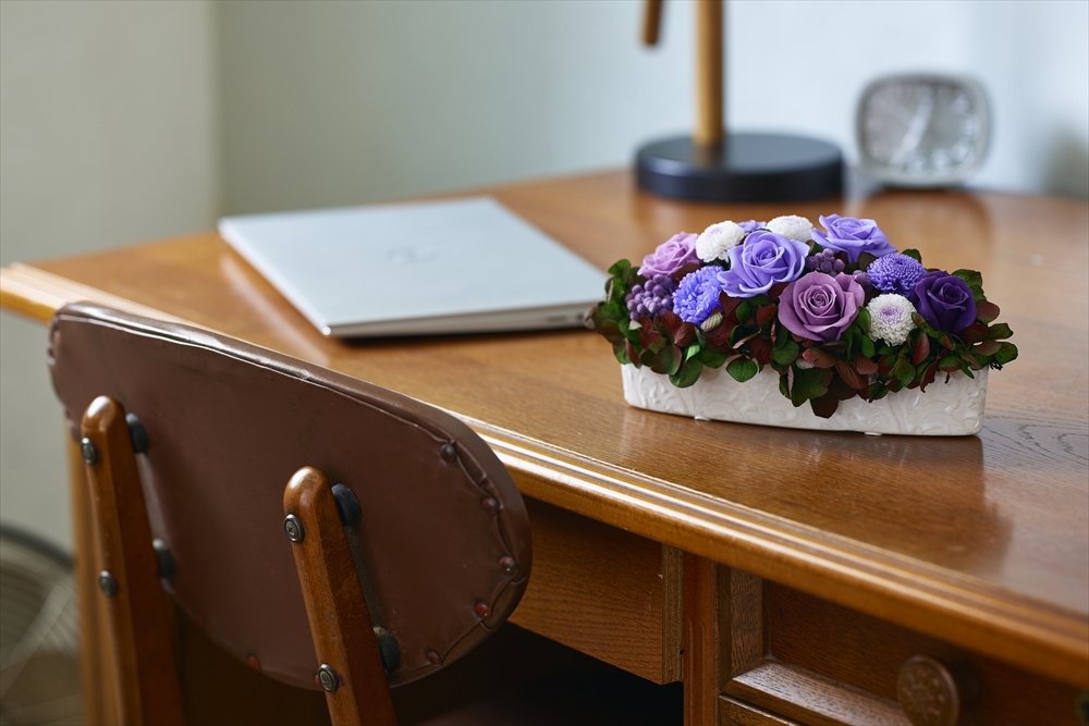 仕事に集中できるよう寒色系の花でまとめ、