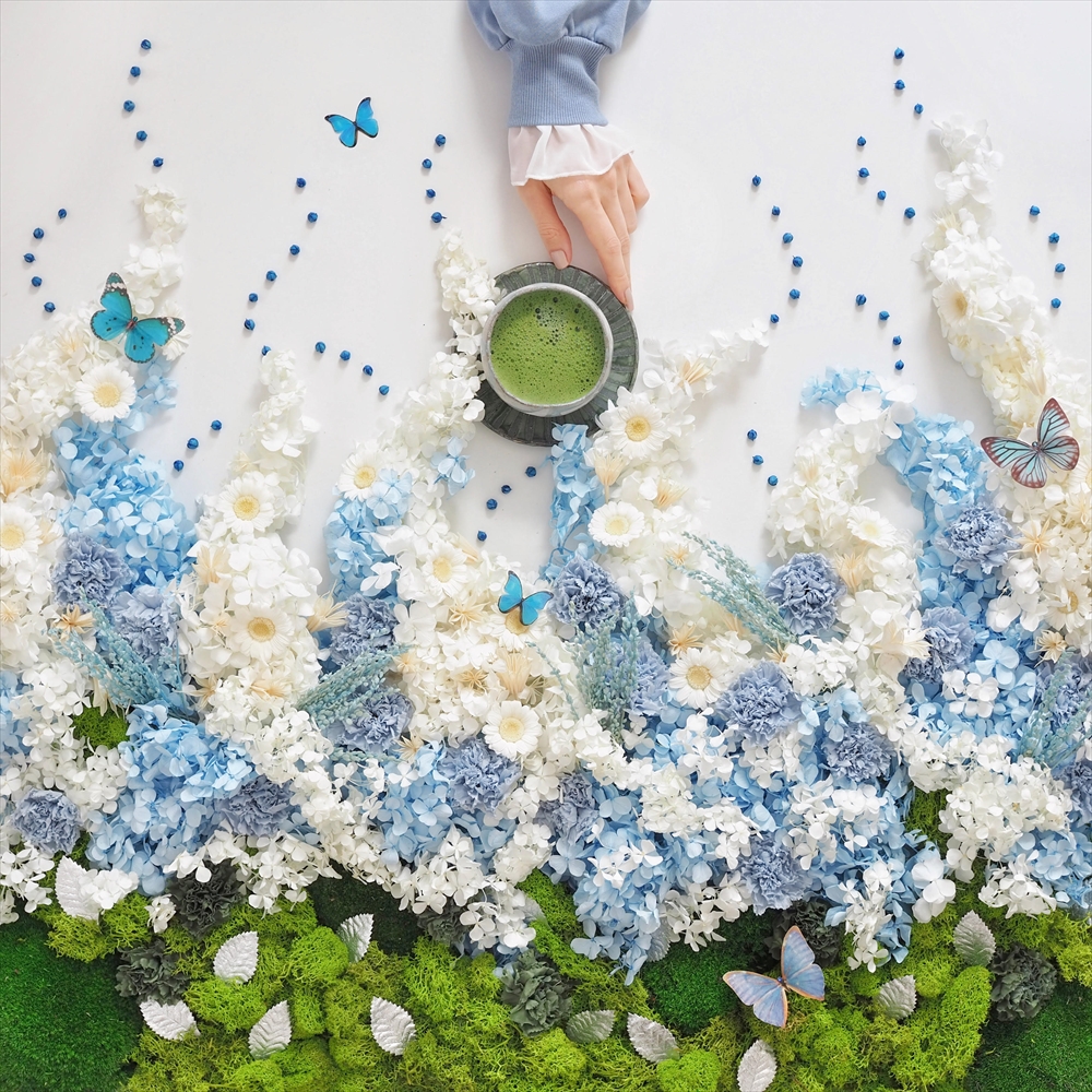 “水の精霊”が作り出す、幻想的な水の世界。下から上へとわき上がる水を花で表現しました。