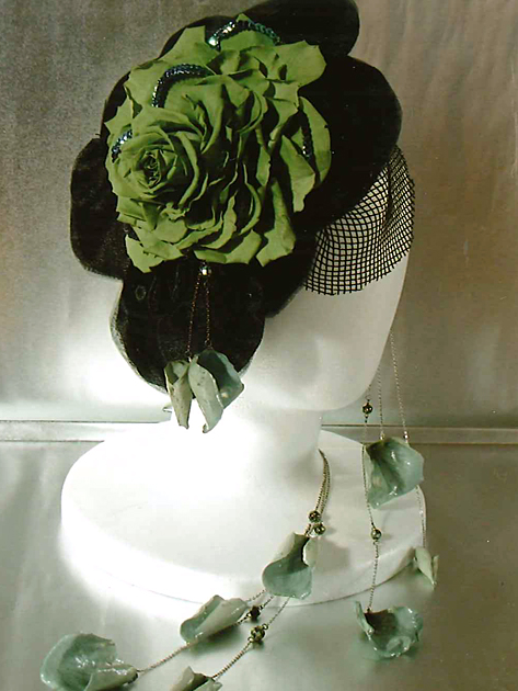 作成PR グリーンティの上品さと渋さにきらめきを添えました。クリスタルコーティングした花びらでジュエリー感アップです。