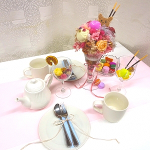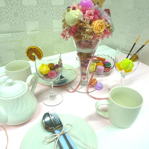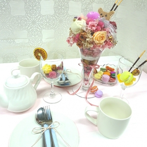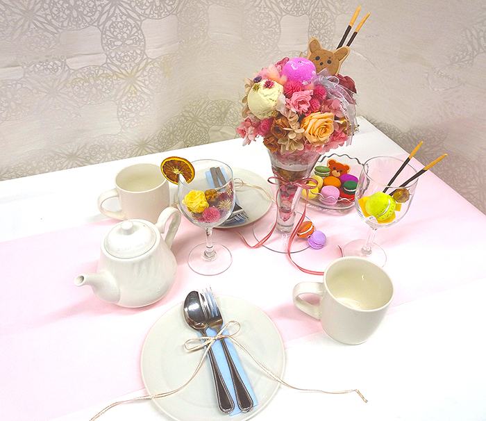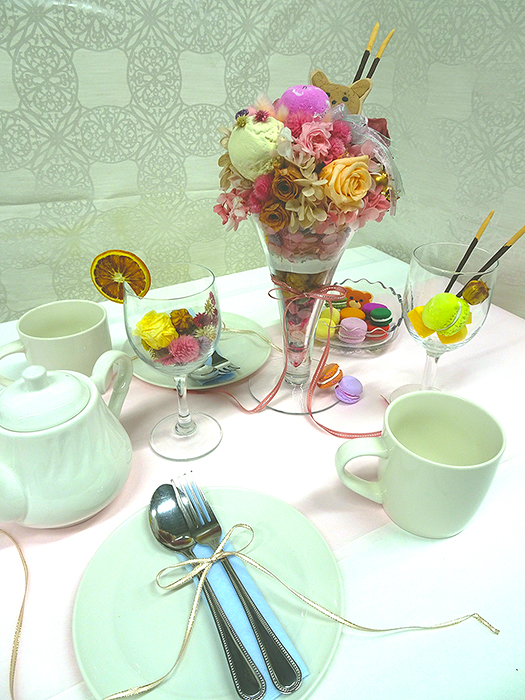 テーブルの中心にメインとなる色とりどりなパフェのアレンジを置いて、わいわいとにぎやかに子供たちがティータイムを楽しんでいるイメージで作りました。